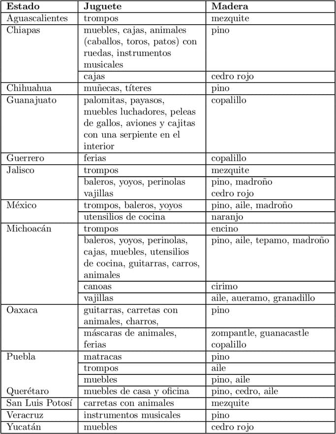 Trompos, baleros, loterías y yoyos forman parte de la variedad de juguetes artesanales de madera y son los estados de Michoacán, Guerrero, Guanajuato, Chiapas y el Estado de México sus principales productores. Cada estado cuenta con sus especialidades y el tipo de madera que utilizan cambia de acuerdo con cada región (Tabla 1).