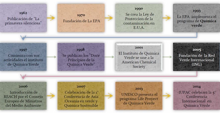 Es propio acotar la historia de esta tendencia en una línea del tiempo que comienza en 1962 (Figura 1), cuando la escritora, bióloga y entusiasta de la conservación ambiental, Rachel Carson, publicó el libro La primavera silenciosa, obra que inspiró al movimiento ambientalista moderno. En ella se abordan temas como los peligros de la contaminación ambiental provocada, a lo largo de los años, por las industrias. Este trabajo es de gran trascendencia, pues ayudó a crear una conciencia social sobre el futuro del medio ambiente. La influencia de este libro fue tal que, años más tarde (1969), en EUA se estableció el Comité Asesor de Ciudadanos de Calidad Ambiental y el Consejo de Calidad Ambiental, un año después se creó la Agencia de Protección Ambiental de EUA (EPA por sus siglas en inglés) y en 1990 se aprobó el Acta para la prevención de la contaminación en Estados Unidos. El término química verde fue acuñado por la EPA en 1993 y se define como “el diseño de productos y procesos químicos que reducen o eliminan el uso o generación de sustancias peligrosas”, otro término ampliamente manejado y que tiene el mismo significado es química sostenible.