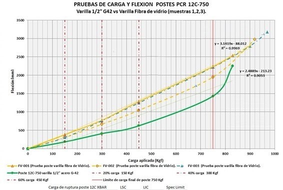 Figura 1. Pruebas de carga y flexión en postes PCR 12c-750. Varilla 1/2 pulgadas G42 vs. Varilla fibra de vidrio (mjuestras 1,2, y 3).