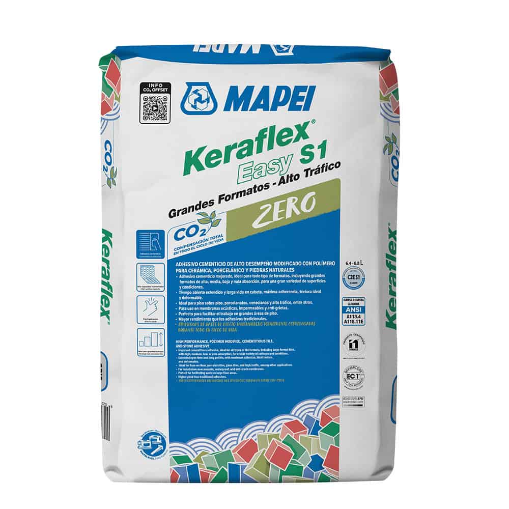KERAFLEX EASY S1 ZERO El adhesivo para losetas de gran formato instaladas en grandes superficies, con CO2 completamente compensado durante todo el ciclo de vida. Adhesivo cementoso deformable de alto rendimiento, fácil de aplicar, de color gris y blanco, con tiempo abierto extendido, alta capacidad de humectación, muy baja emisión de compuestos orgánicos volátiles y con compensación de las emisiones de gases de efecto invernadero