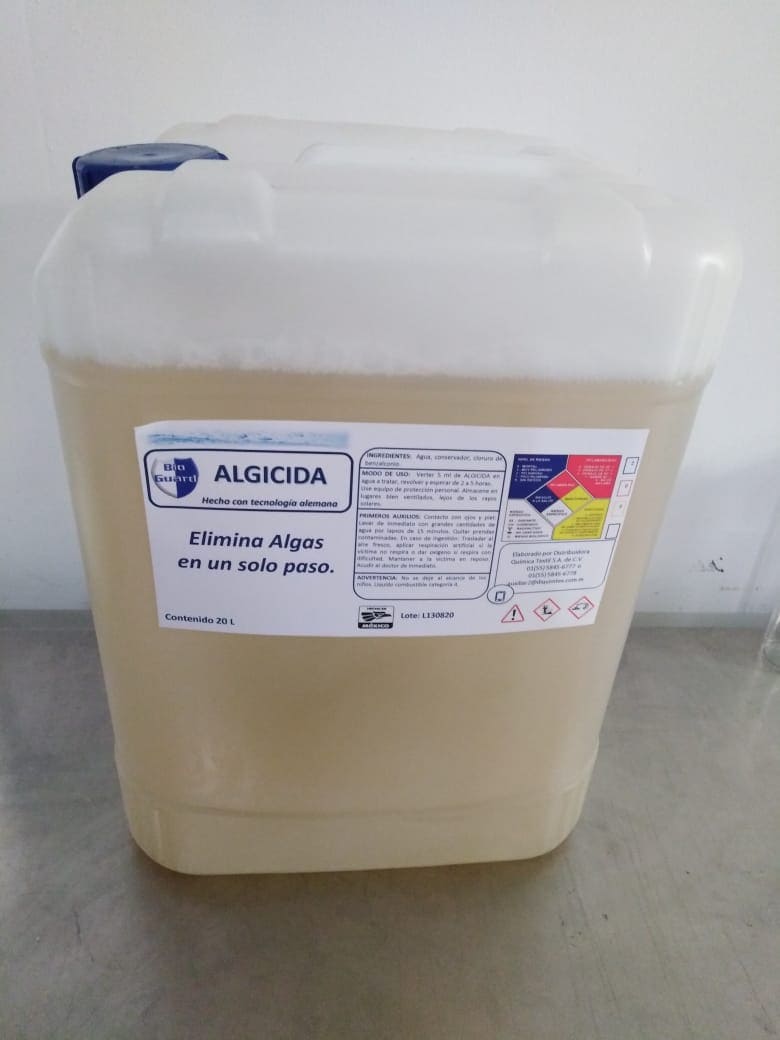 Es un líquido concentrado de sales cuaternarias base agua de quinta generación, que tiene cualidades desinfectantes, germicida, algicidas, fungicida, tiene un efecto prolongado. Solo se le debe agregar al agua que se quiera tratar e iniciará a funcionar de inmediato. Usos Tratamiento de agua industrial o albercas y fuentes para la reducción o eliminación de algas que se pegan en las paredes o están flotando en el agua, estas algas son las que generan un color verde al agua. Ventajas • Alta concentración • Gran rendimiento • Es de fácil aplicación • Es muy económico • No cambia la apariencia del agua • No afecta la dureza del agua • No contiene metales pesados • Se puede usar de manera manual o en sistemas dosificadores automáticos