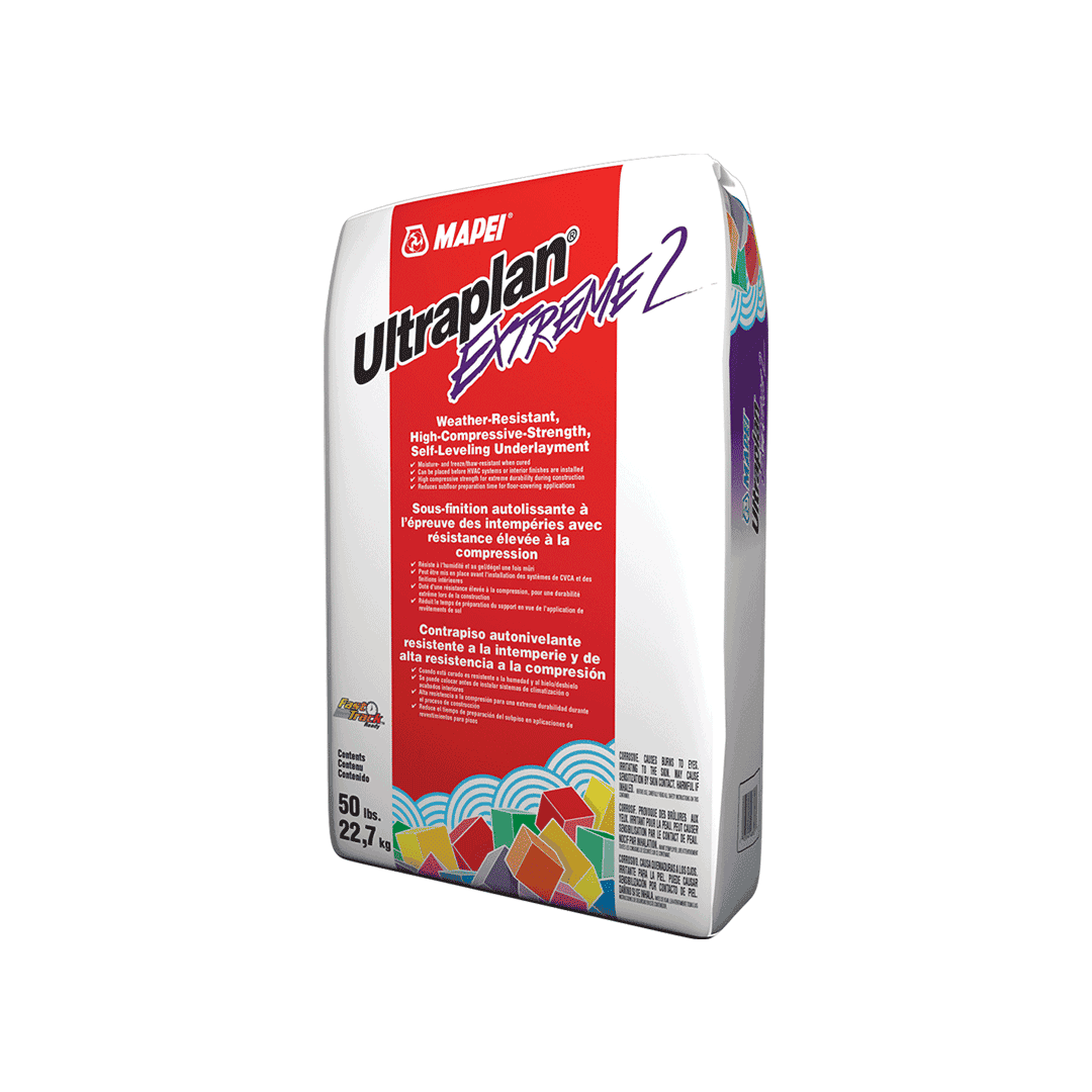 Contrapiso autonivelante resistente a la intemperie y de alta resistencia a la compresión. Ultraplan Extreme 2 es un avanzado compuesto hidráulico autonivelante a base de cemento, diseñado para aplicaciones de contrapisos de ejecución rápida. Está especialmente formulado para nivelar superficies de concreto horizontales en espacios interiores donde no hay implementados controles ambientales, o la edificación no está totalmente cerrada. Una vez instalado, Ultraplan Extreme 2 no se ve afectado por la exposición a lluvia intermitente después de 6 horas, o a temperaturas de congelamiento después de 3 días de curado. Su alta resistencia a la compresión está diseñada para permitir que se exponga a tráfico como capa temporal de desgaste hasta que el piso reciba un recubrimiento con un revestimiento para pisos. Ultraplan Extreme 2 no tiene limitaciones por emisión de vapor húmedo y puede instalarse sin probar sobre sustratos de concreto debidamente preparados. Es el compuesto autonivelante a elegir para usarlo bajo sistemas adhesivos de control de humedad y barreras epoxi contra la humedad.