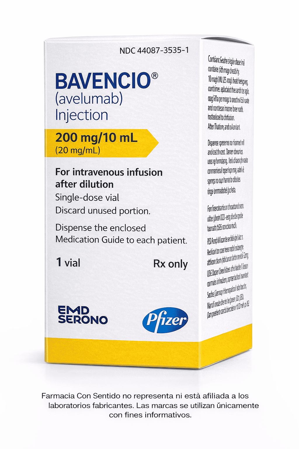 El avelumab es un medicamento de uso altamente especializado que forma parte del manejo de enfermedades oncológicas, siempre bajo indicación y supervisión médica especializada. Su administración se integra dentro de esquemas terapéuticos definidos de manera individual, conforme a la condición clínica del paciente y la valoración del médico tratante. En Farmacia Con Sentido trabajamos con un firme compromiso por ofrecer medicamentos de origen trazable, cuidando la calidad del producto y acompañando de manera cercana y responsable a cada paciente y familia durante todo el proceso, comprendiendo la relevancia de la continuidad en tratamientos oncológicos.