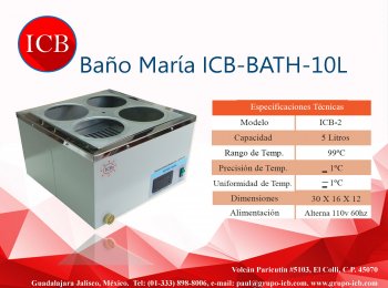 BAÑO MARIA ICB-BATH DE 10 LITROS CON TAPA JJ. El Baño Digital ICB-4 es un sistema de temperatura estable que se usa para destilación, secado, concentración, calentamientos de tubos de muestra, etc.