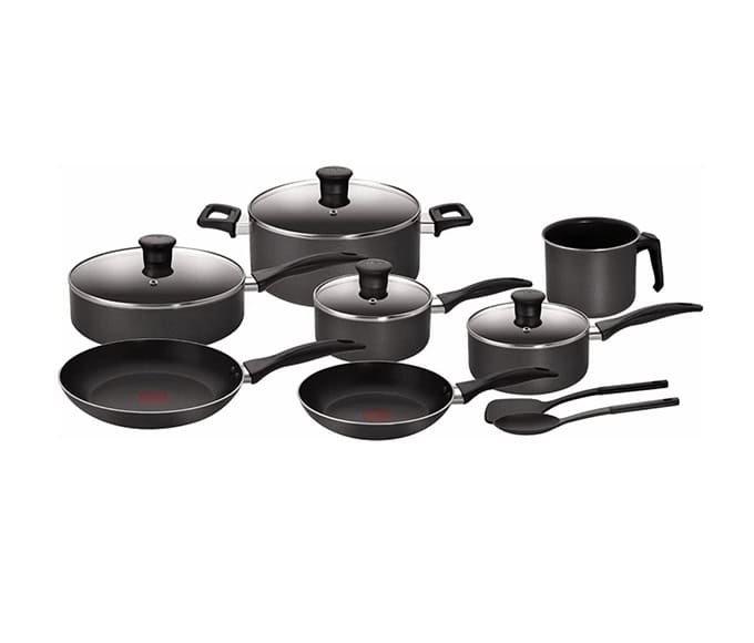 Batería Family Cook 13 piezas T fal que Incluye: 2 Sartenes, 1 Cacerola más tapa de 24 cm, 1 olla de 24 cm con tapa, 1 cazo de 16cm más tapa, 1 cazo de 18 cm más tapa, 1 lechero y dos utensilios.
