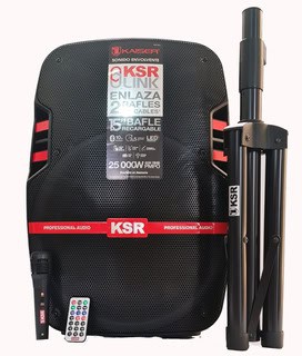 BOCINA 15” KAISER COLORS KSW-5015 -USB, microsd, auxiliar, radio y bluetooth -25,000 W P.M.P.O -30W RMS -Batería Recargable con duración de 3,5hrs -Perillas para ecualizar -Cuenta con LEDS indicadores del estatus de la batería -Con terminales para batería externa -Práctica con asas laterales, superior y ruedas para transportar -Perilla trasera para fijar el bafle al tripie