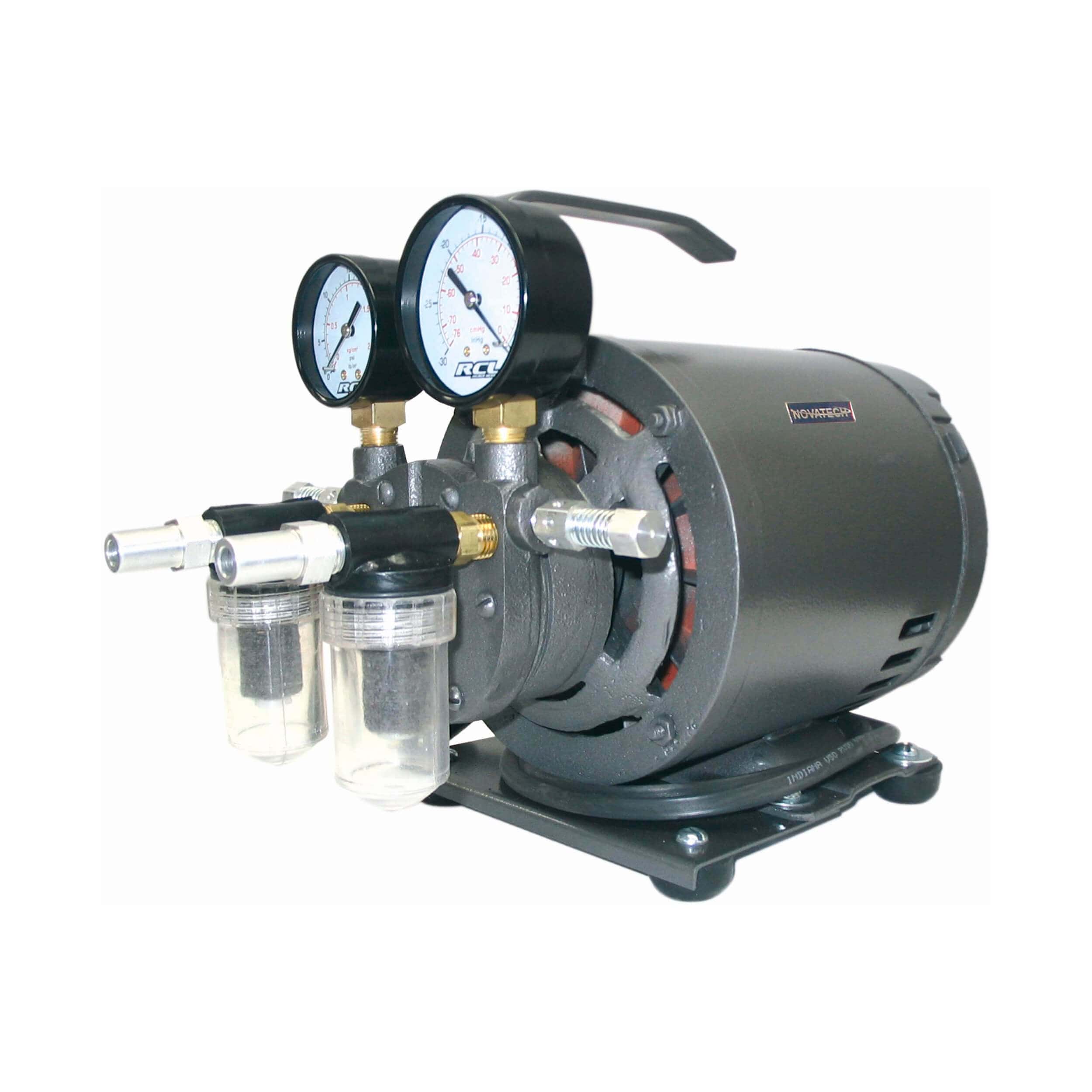Desplazamiento de 60 lt/min presión garantizada de 20 pulg/hg acoplada a un motor de 1/2 hp. Incluye: 2 filtros para retención de polvo y humedad 2 válvulas para regular extracción y presión 1 mano-vacuómetro de fácil lectura para el vacío 1 manómetro para la presión de aire. Sistema de vacío por medio de alavés de celoron. Lubricada en aceite por goteo. Voltaje de operación 120 v / 60 hz .
