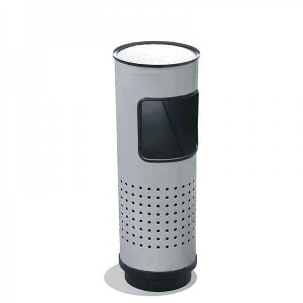 Bote de acero con cenicero. Diseño punzonado. Cubierto con pintura electrostática. Cuenta con un contenedor interior de plástico. Tapa de plástico con granillo. Base plástico de alta resistencia. Capacidad 24 LTS. Medidas: 23 x 65 cm