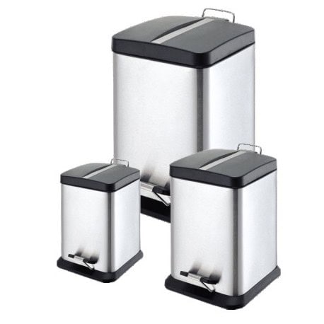 Botes de acero inoxidable cuadrados con tapa y pedal. Cuentan en su interior con un contenedor de plástico con asa. Base y tapa en polipropileno rígido para una larga vida. Capacidad 6 lts, 12 lts, 20 lts.
