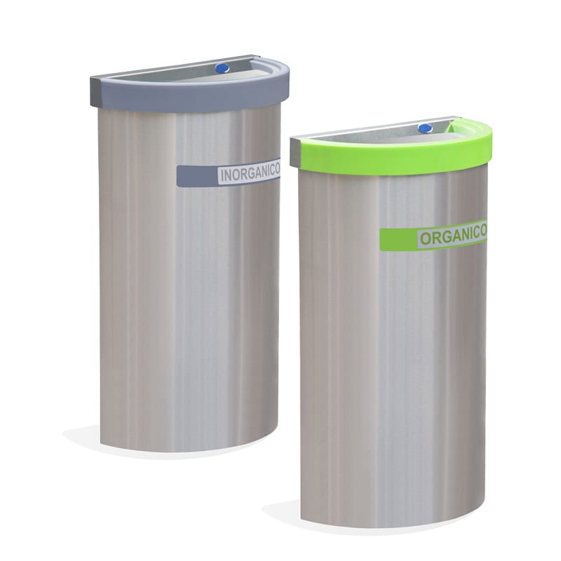 Botes de acero inoxidable ecológicos medio punto. -Tapas de plástico rígido en color gris, verde, naranja, negro. -Balancín de acero inoxidable pulido. -Cinturón interno para sujetar la bolsa. -Etiquetas clasificadoras opcionales. -Medidas: 49x25x60cm y 49x25x80cm -Producto reciclable gracias a sus materiales y sistemas de fabricación. -Producto accesible a personas discapacitadas.