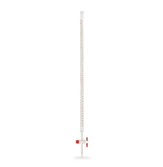 Bureta recta clase B con llave de PTFE, se utiliza para las titulaciones de propósito general y análisis volumétrico en escuelas y laboratorios institucionales. Fabricada en vidrio de borosilicato, viene graduada en esmalte ámbar, con llave de PTFE (teflón) y es resistente a químicos. Cumple los requisitos de la ASTM E287.