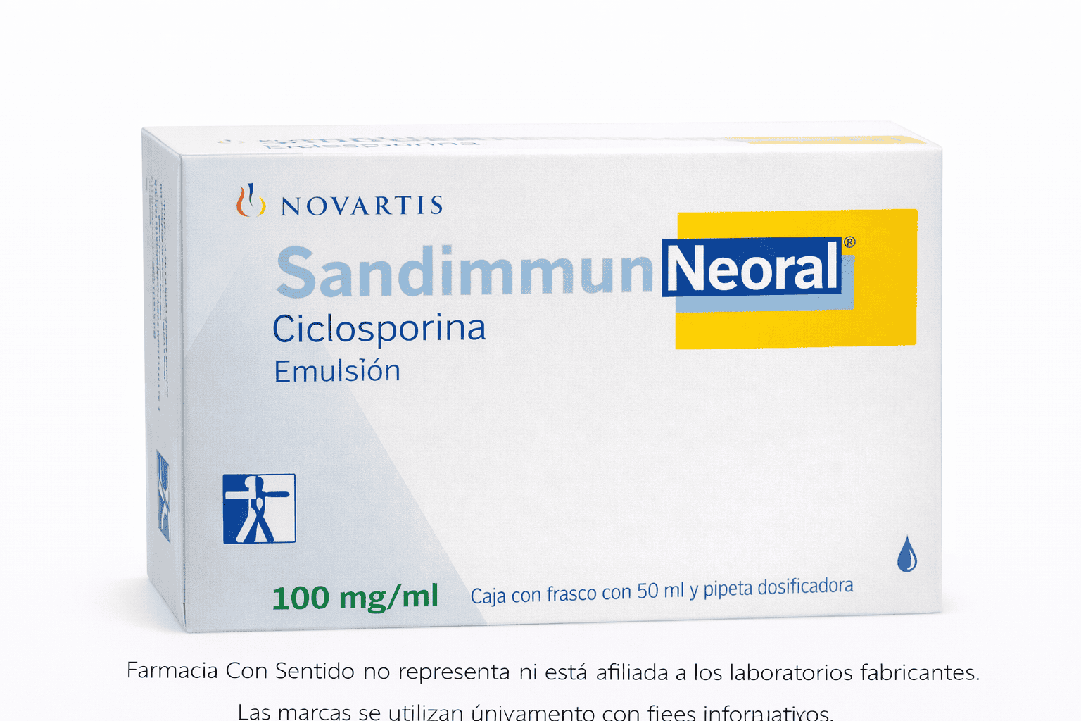 La ciclosporina es un medicamento de alta especialidad utilizado dentro de esquemas terapéuticos inmunológicos específicos, siempre bajo indicación y supervisión médica especializada. Su uso forma parte de tratamientos individualizados definidos por el médico tratante, considerando el diagnóstico, antecedentes clínicos y condición particular del paciente. Requiere seguimiento médico periódico y control clínico. En Farmacia Con Sentido mantenemos un firme compromiso con la calidad y trazabilidad de cada medicamento, brindando acompañamiento cercano, profesional y respetuoso durante todo el proceso de cotización y coordinación de entrega.