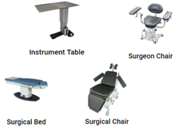 -INSTRUMENT TABLE: Mesa electrica, ideal para sus instrumentos quirurgicos, altura ajustable por encima de la cama. -SURGEON CHAIR: Silla para cirujano, todas las comodidades para su dia quirurgico. -SURGICAL BED: Cama quirurgica principalmente para varias cirugias en oftalmologia. Ajuste y posicionamiento de la cabeza. -SURGICAL CHAIR: Silla-cama quirurgica, para traslado del paciente, con multiples accesorios, electrica, bateria recargable.