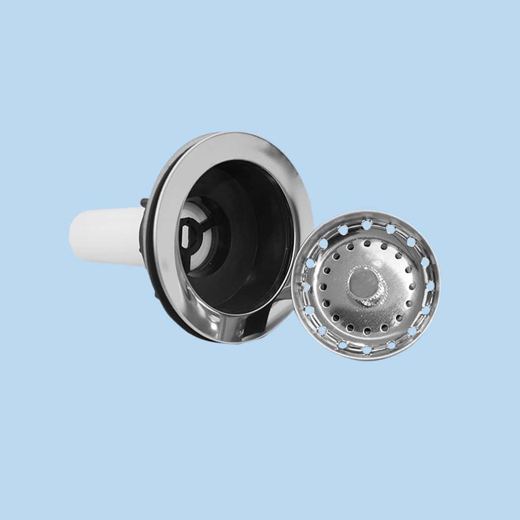 Contracanasta PVC con Acero Inox. Forma una barrera entre el desagüe y tu casa que evita que los gases de la tubería retornen a tu casa, la canasta se jala para desaguar el fregadero y esta no deja pasar los restos de comida