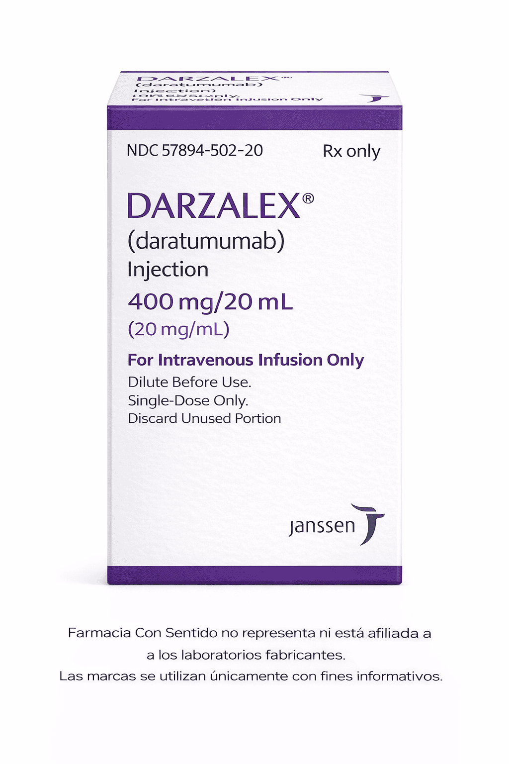 El daratumumab es un medicamento biotecnológico de alta especialidad utilizado dentro de esquemas terapéuticos oncohematológicos, siempre bajo indicación y supervisión médica especializada. Su administración forma parte de protocolos individualizados definidos por el médico tratante, considerando el diagnóstico, evolución clínica y características particulares del paciente. En Farmacia Con Sentido mantenemos un firme compromiso con la calidad y trazabilidad de cada medicamento, brindando acompañamiento cercano, profesional y respetuoso durante todo el proceso de cotización y coordinación de entrega.