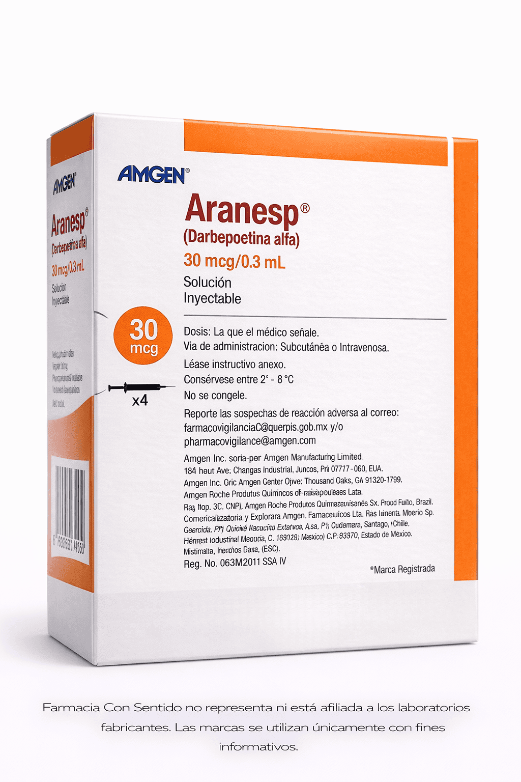 La darbepoetina alfa es un medicamento de alta especialidad utilizado dentro de esquemas terapéuticos para el manejo de condiciones asociadas a alteraciones en la producción de glóbulos rojos, siempre bajo indicación y supervisión médica especializada. Su uso se define conforme a la valoración clínica individual realizada por el médico tratante, considerando el diagnóstico, parámetros de laboratorio y estado general del paciente. En Farmacia Con Sentido mantenemos un firme compromiso con la calidad y trazabilidad de cada medicamento, brindando acompañamiento cercano, profesional y respetuoso durante todo el proceso de cotización y coordinación de entrega.