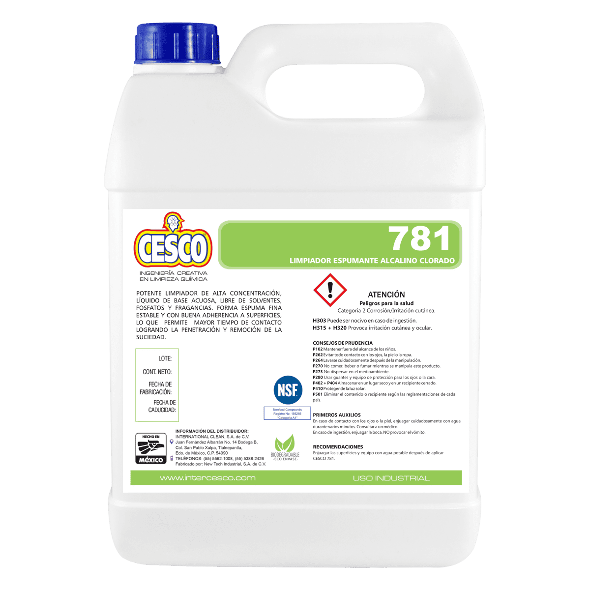 Limpiador alcalino para limpiezas de fase única con alto poder de detergencia. De rápida acción con características desinfectantes contra microorganismos patógenos, formador de espuma "activa" que penetra y remueve suciedades pesadas, películas de proteínas, pigmentos, saborizantes, depósitos de almidón adheridos a equipos, reactores, máquinas, etc. Ideal para su uso en sistemas espumadores para limpieza de superficies verticales como son paredes, tuberías altas, exteriores de equipos,etc. Cuenta con certificación NSF.