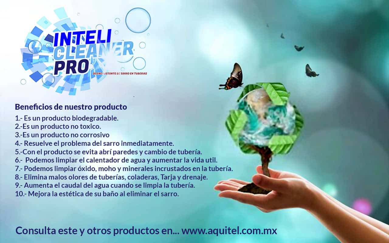 INTELI CLEANER PRO se aplica en tinaco controlando el nivel del agua a 50 litros después agregar 1 o 2 Porrones de 20 litros de Desincrustante dependiendo del tamaño de la casa o tubería, posteriormente con una escoba o cepillo frotar las paredes interiores del tinaco, abrir las llaves del hogar, oficina o restaurant durante 30 segundos par que la solución de agua y Desincrustante circulen por las tuberías, dejar que esta solución de limpieza actúe durante 4 horas mínimo, abrir todas las llaves para que la suciedad salga, realizar un enjuague y listo,