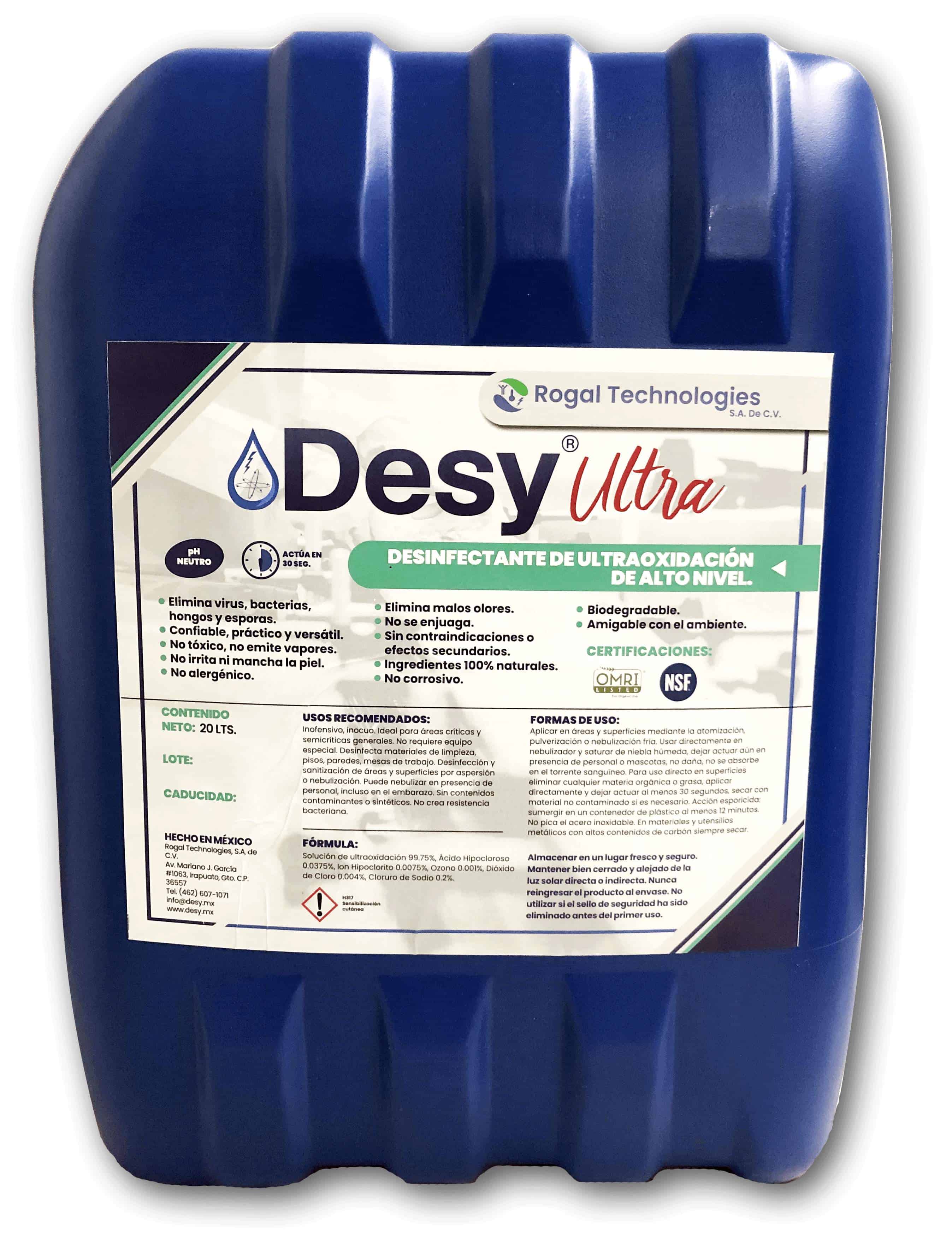 DESY® es un desinfectante electrolizado de superoxidación, natural, orgánico, no tóxico, no irritante, ambiental y ecológicamente seguro, ideal para la desinfección y sanitización de áreas, herramientas, superficies y equipos, de espectro completo, capaz de causar daños irreversibles a grandes grupos sistemáticos de microorganismos, entre ellos: virus, bacterias, esporas, hongos, levaduras y biopelículas, con un grado de eliminación del 99.999%, en cuestión de segundos. Producto grado alimenticio. Certificado NSF. Certificado OMRI. Este producto es aceptable para usar como desinfectante en todas las superficies, no siempre requiriendo un enjuague, en y alrededor, de las áreas de procesamiento de alimentos. Este producto es aceptable para su uso en carnes, aves y otras áreas de procesamiento de alimentos, así como un producto para el lavado de frutas y verduras.