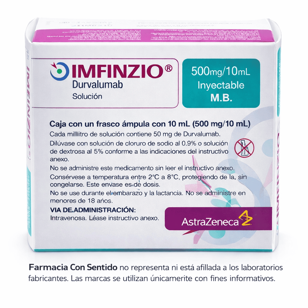 El durvalumab es un medicamento biotecnológico de alta especialidad utilizado dentro de esquemas terapéuticos oncológicos, siempre bajo indicación y supervisión médica especializada. Su administración forma parte de protocolos individualizados definidos por el médico tratante, considerando el diagnóstico, estadio de la enfermedad y características clínicas del paciente. Se utiliza en entornos hospitalarios o clínicos controlados. En Farmacia Con Sentido mantenemos un firme compromiso con la calidad y trazabilidad de cada medicamento, brindando acompañamiento cercano, profesional y respetuoso durante todo el proceso de cotización y coordinación de entrega.