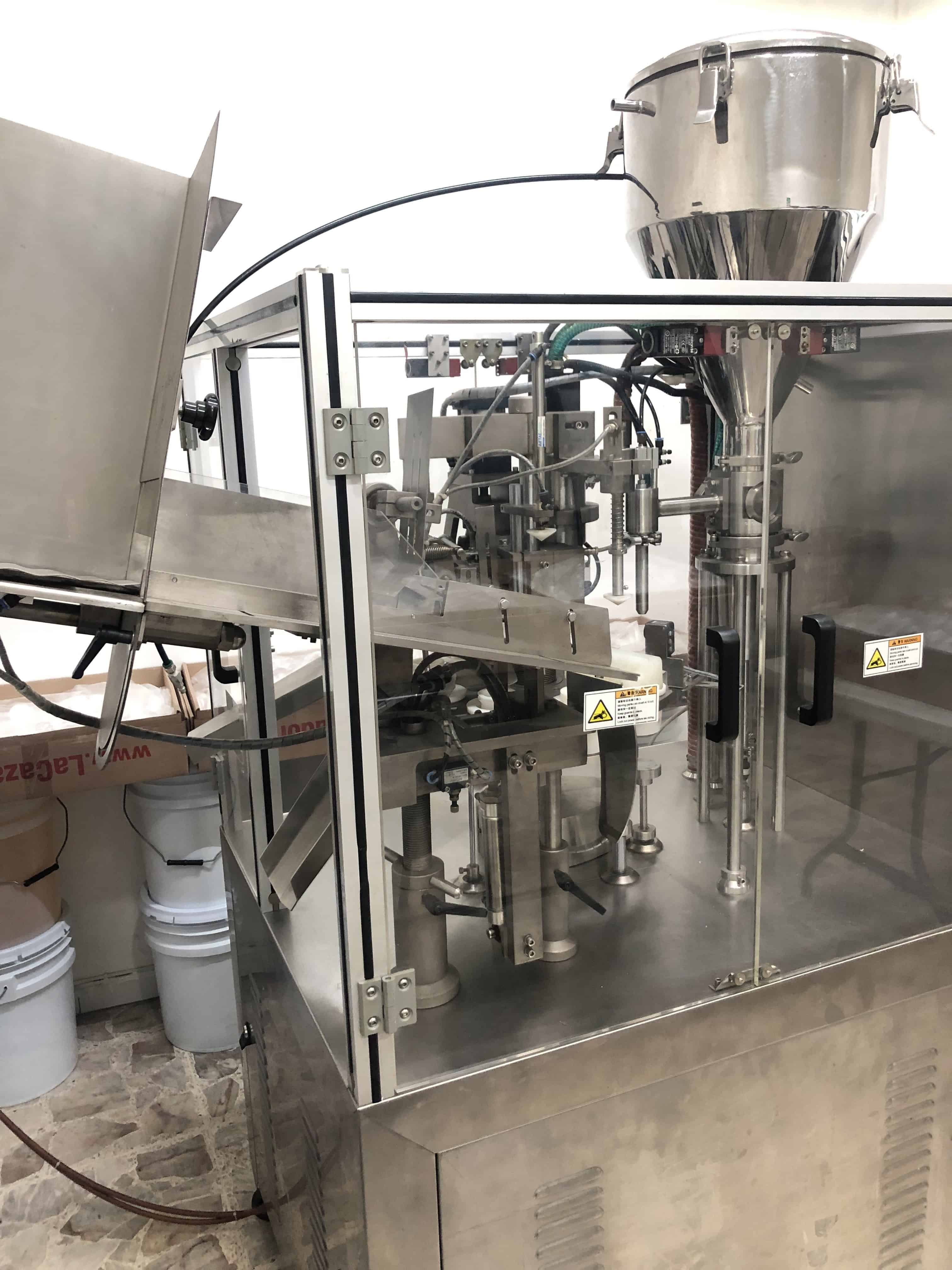 Máquina para llenar y envasar tubos depresibles para el acondicionamiento de productos cosméticos de diferentes rangos de viscosidad. El sistema de llenado dosifica hasta 100 gramos de producto.