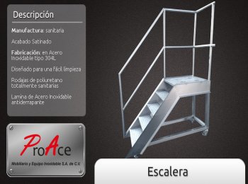 Escalera, manufactura sanitaria, acabado satinado, en acero inoxidable tipo 304L, lámina antiderrapante, ruedas de poliuretano sanitarias. Uso industria farmacéutica y general. Fabricación de diseños y medidas especiales