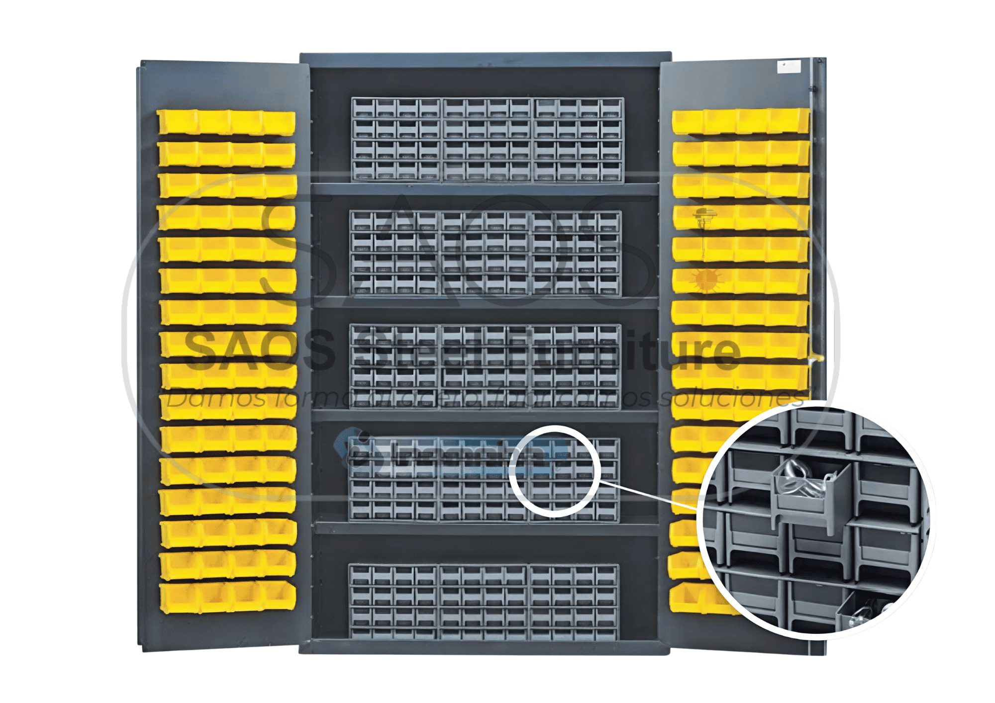 Los gabinetes de puerta al ras ofrecen una mejor organización, más espacio y mayor seguridad de almacenamiento para piezas, insumos y herramienta de alto valor, fabricados en lámina de acero al carbón calibre 14 ASTM tensonivelada totalmente soldado, acabado en aplicación de pintura en polvo horneada lo que garantiza años de servicio pesado y protección a la corrosión y humedad, chapa con 3 puntos de sujeción con 2 llaves y bisagras de piano calibre 14 soldadas a las puertas para mayor resistencia y durabilidad. Optimice sus espacios de almacenamiento utilizando sus paneles ranurados para recibir contenedores plásticos colgantes de almacenamiento.