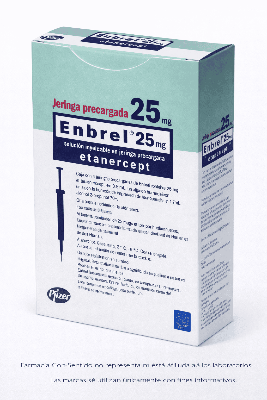 El etanercept es un medicamento biotecnológico de alta especialidad utilizado dentro de esquemas terapéuticos para enfermedades autoinmunes e inflamatorias específicas, siempre bajo indicación y supervisión médica especializada. Su administración forma parte de tratamientos individualizados definidos por el médico tratante, considerando el diagnóstico, actividad de la enfermedad y condición clínica del paciente. Requiere seguimiento médico periódico y control clínico conforme a lineamientos profesionales. En Farmacia Con Sentido mantenemos un firme compromiso con la calidad y trazabilidad de cada medicamento, brindando acompañamiento cercano, profesional y respetuoso durante todo el proceso.