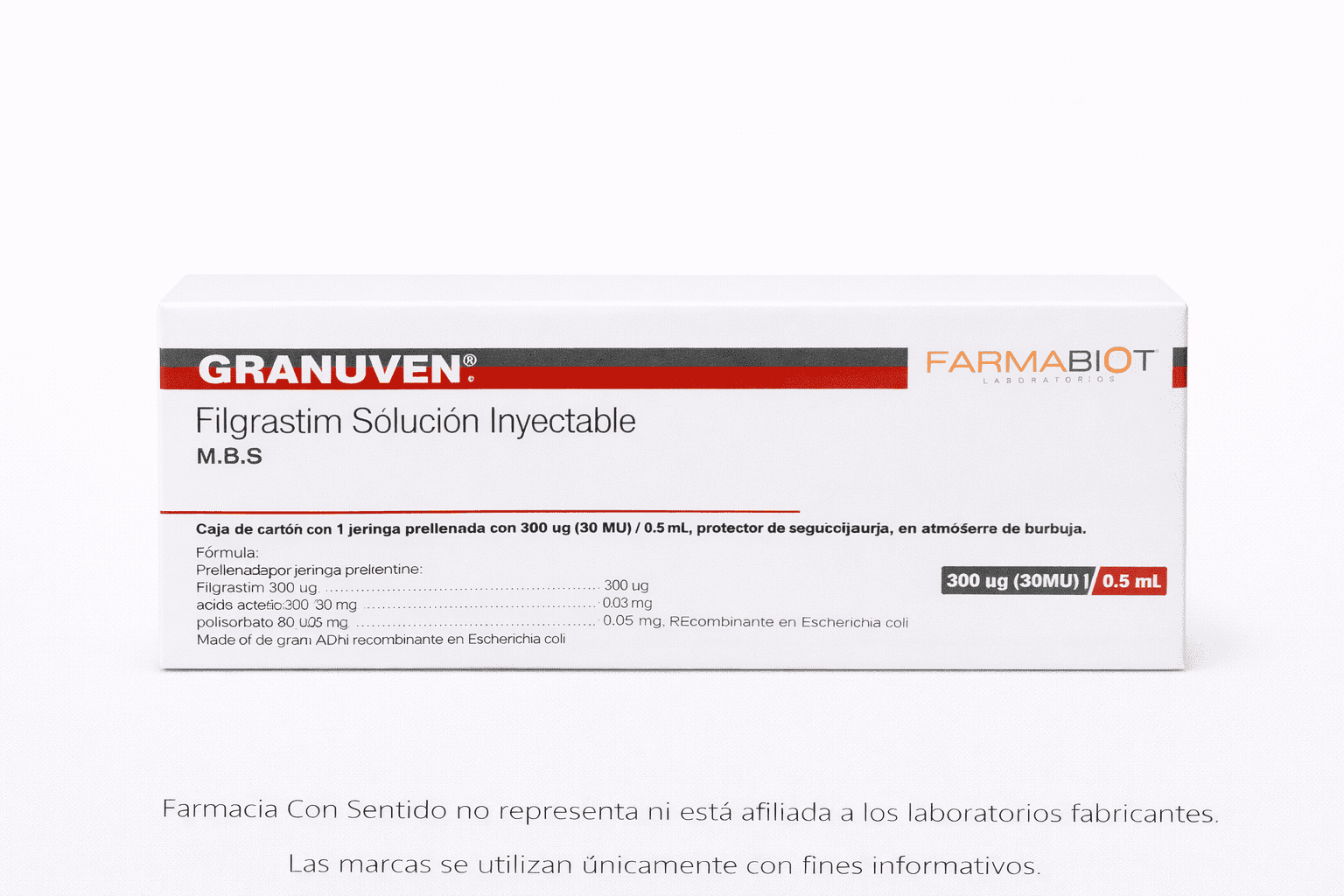 El filgrastim es un medicamento de uso altamente especializado que forma parte del manejo de condiciones hematológicas asociadas a tratamientos oncológicos, siempre bajo indicación y supervisión médica especializada. Su administración se integra dentro de esquemas terapéuticos definidos de manera individual, conforme a la condición clínica del paciente y la valoración del equipo médico tratante. En Farmacia Con Sentido trabajamos con un firme compromiso por ofrecer medicamentos de origen trazable, cuidando la calidad del producto y acompañando de manera cercana y responsable a cada paciente y familia.