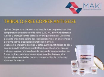 Tribol Q-Free Copper Anti-Seize Q-Free Copper Anti-Seize es una mezcla libre de plomo con una temperatura de operación de hasta 1100 º C. Este Anti-ferrante lubrica y protege contra corrosión y ataque químico. Use como pasta de ensamblaje para dar lubricación inicial en el arranque y para impedir la excoriación durante el montaje.