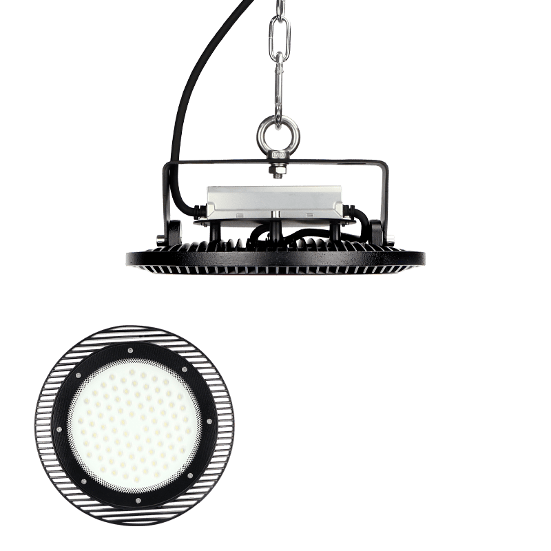 Luminaria High Bay de aluminio suspendida de un aro de acero inoxidable.