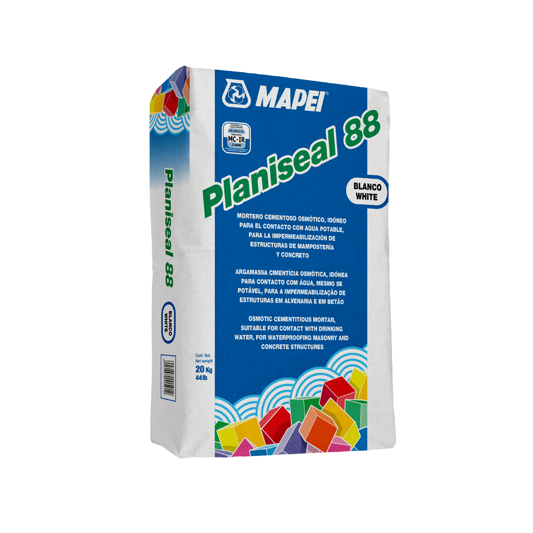 Planiseal 88 Mortero cementoso osmótico, apto para el contacto con agua potable, para la impermeabilización de estructuras de albañilería y de concreto Para impermeabilización de: Depósitos de agua potable. Muros internos y externos de sótanos. Locales húmedos. Piscinas. Fosas de ascensor. Galerías de servicio. Muros de cimentación. Canales de riego.