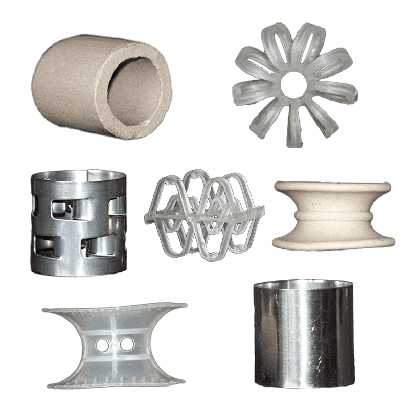 Anillos Pall, Anillos Raschig, Silletas tipo Intalox, Teleretes, Tri-Packs, Esferas o cualquier tipo de empaque.