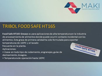 Tribol Food Safe HT165 Food Safe HT165 Grease es para aplicaciones de alta temperatura en la industria de procesamiento de alimentos donde puede ocurrir contacto incidental con los alimentos. Esta grasa de primera calidad ha sido formulada para soportar temperaturas de 165ºC y el lavado frecuente en la planta. Aplicaciones: • Úsese en todo tipo de rodamiento, engranajes, guías de deslizamiento, bisagras. • Temperatura de operación hasta 165ºC