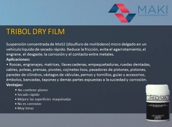 Tribol Dry Film Suspensión concentrada de MoS2 (disulfuro de molibdeno) micro delgado en un vehículo liquido de secado rápido. Reduce la fricción, evita el agarrotamiento, el engrane, el desgaste, la corrosión y el contacto entre metales. Aplicaciones: • Roscas, engranajes, matrices, llaves cadenas, empaquetaduras, ruedas dentadas, cables, poleas, prensas, pivotes, cojinetes lisos, pasadores de pistones, pistones, paredes de cilindros, vástagos de válvulas, pernos y tornillos, guías y más.