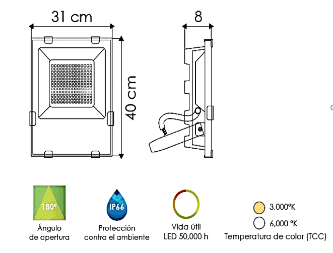 Luminaria de aluminio y cristal templado con potencia de 100 w y frecuencia de 50-60Hz. Tensión eléctrica 100-240V