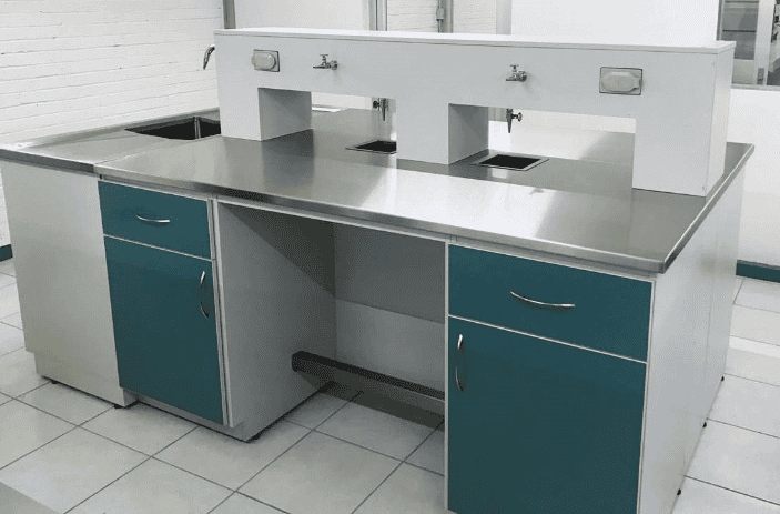 Mesa isla con puente con servicios eléctricos y gas. Largo 2.6m, fondo 1.20m y alto 0.90m. Con 1 estación de lavado al extremo con tarja y llave cuello de ganzo incluidos. 4 gabinetes en total. Configuración a elegir entre cajones y puertas. Colores a Elegir. Construida en melamina antifuego y antihumedad. Cubierta en acero inoxidable tipo 304.
