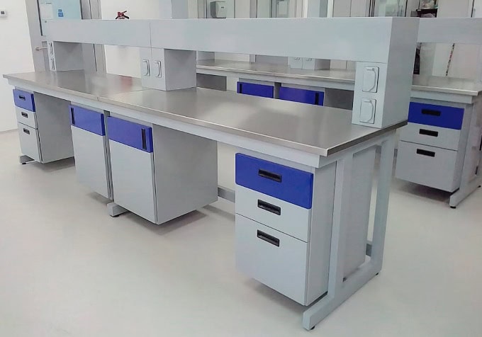 Mesa laboratorio «Slim Fit» Largo 3m, fondo 0.70 m y alto 0.90m. 2 gabinetes con 3 cajones. 2 gabinetes cajón – puerta. Colores y configuración a elegir. Gabinetes puente a lo largo con contactos eléctricos. Base estructural PTR. Construidos en lamina galvanizada con recubrimiento en pintura electrostática y cubierta de acero inoxidable.