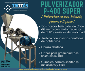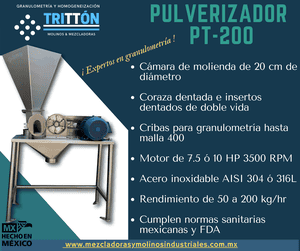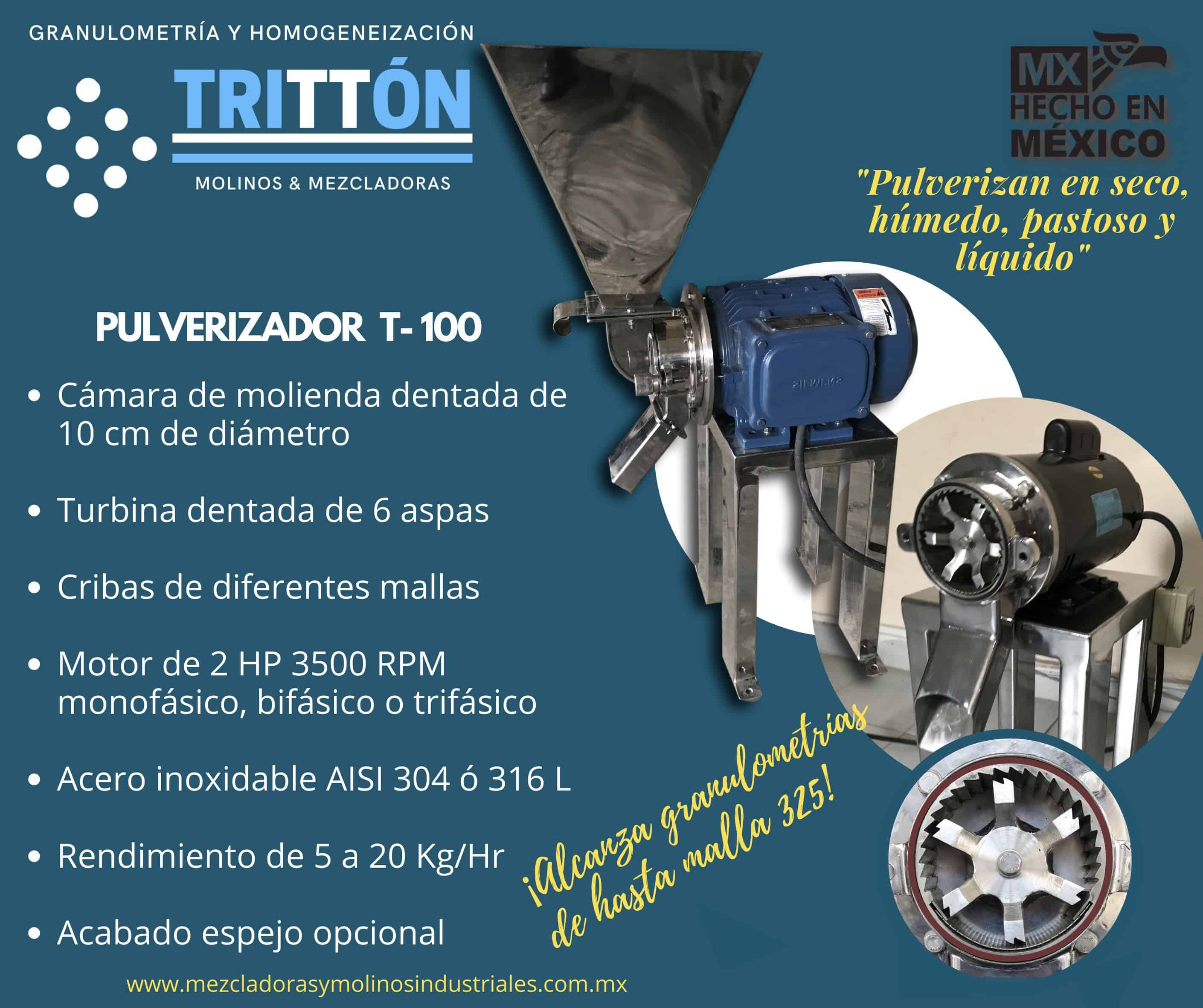 Los pulverizadores TRITTON son diseñados para moler toda clase de productos en seco, húmedo y pastosos, han sido construidos en una variedad de tamaños y capacidades desde los 3Kg/Hr hasta los 4,000 Kg/Hr. La trituración es por medio de turbinas, este principal sistema de molienda es eficiente para la reducción de partículas y tiene diversas aplicaciones que ayudan a la industria farmacéutica, cosmética y/o alimentaria.