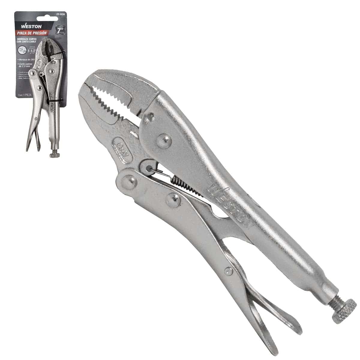 Pinza de presión con mordaza curva CRV con corta cable 7¨. Mordaza de CRV. Tornillo de ajuste de presión. Palanca para liberar pinzas. Agarre firme y seguro. Usos: taller e industria.