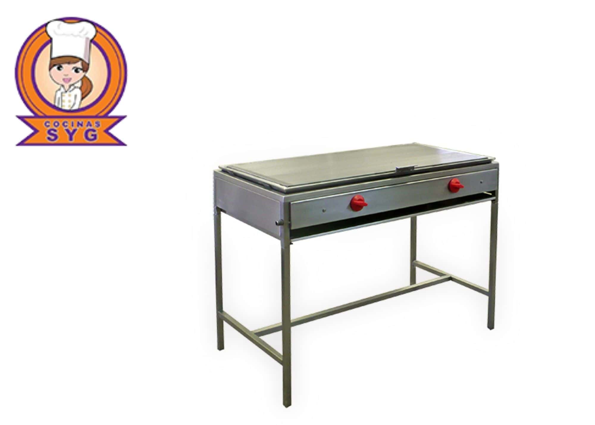 Plancha estructural de 2 quemadores. Estructura en tubular cuadrado de acero inoxidable de 1” Forros y charola para derrames fabricados en lámina de acero inoxidable tipo 430 calibre 20
