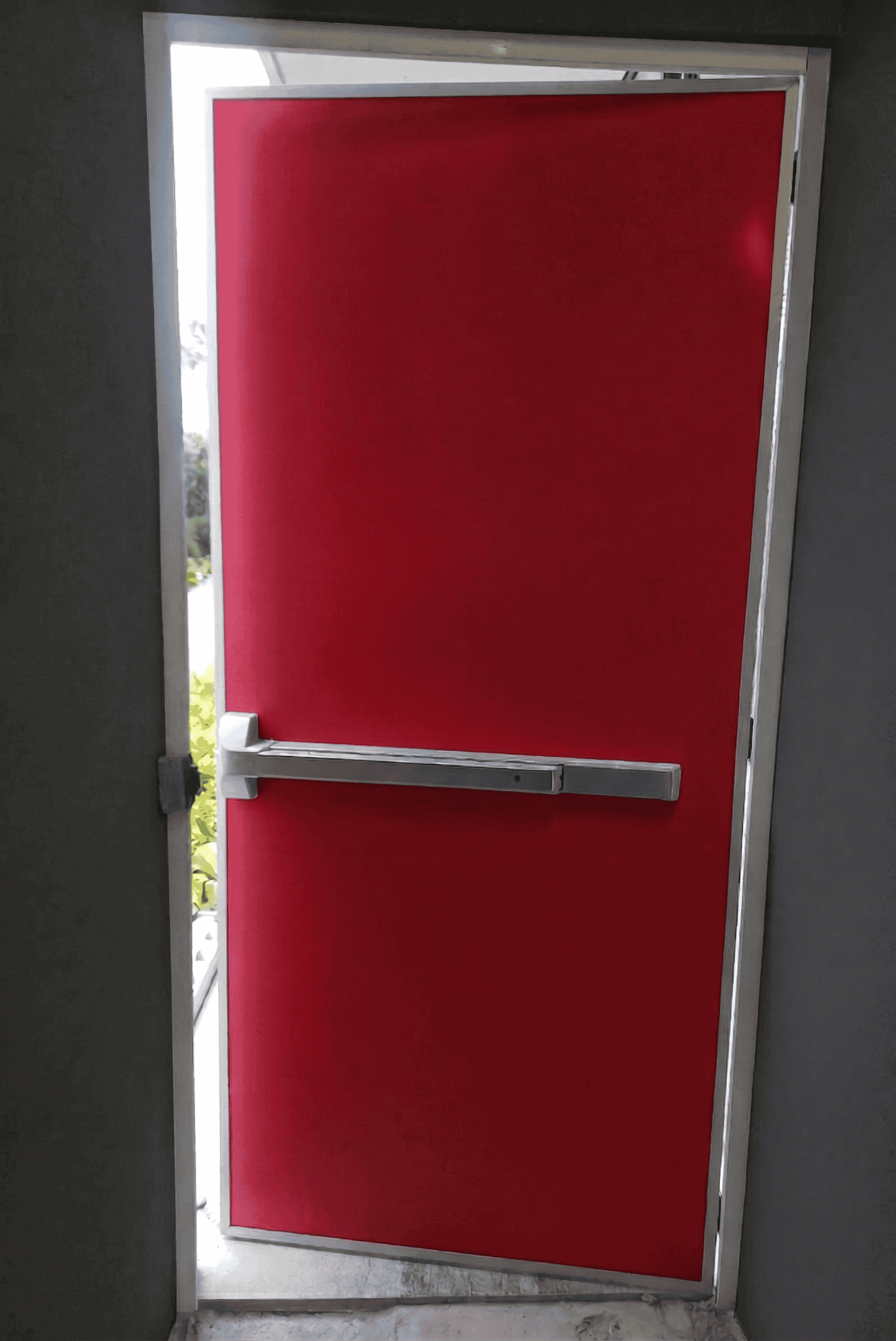 La puerta de emergencia está fabricada con perfil tubular galvanizado calibre 20 de 1 1/4 x 3/4 con uniones perimetrales electrosoldadas que garantizan solidez durabilidad. Cuenta con refuerzos estructurales de 2 , adaptados a las dimensiones solicitadas por el proyecto , y se encuentra preparada para la instalación de barras antipánico, chapas, mirillas y otros accesorios según requerimientos específicos, En su interior incorpora una placa termoaislante de lana mineral, la cual actúa como retardante al fuego y aislante acústico ofreciendo mayor seguridad y confort.