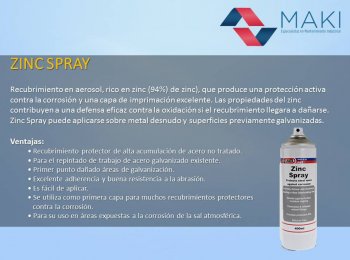 Zinc Spray Recubrimiento en aerosol, rico en zinc (94%) de zinc), que produce una protección activa contra la corrosión y una capa de imprimación excelente. Las propiedades del zinc contribuyen a una defensa eficaz contra la oxidación si el recubrimiento llegara a dañarse. Zinc Spray puede aplicarse sobre metal desnudo y superficies previamente galvanizadas.