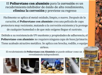 El Poliuretano con aluminio para la corrosión es un recubrimiento inhibidor de óxido de alto rendimiento, elimina la corrosión y previene su regreso Fácilmente se aplica al metal oxidado, limpio, o nuevo. Después de la curación, el Poliuretano con aluminio crea una película de capa protectora muy resistente, matando a la corrosión existente y la protege de cualquier humedad o de que más oxígeno llegue el sustrato.