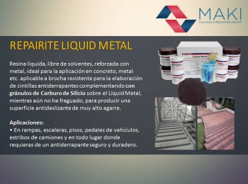 Repairite Liquid Metal Resina liquida, libre de solventes, reforzada con metal, ideal para la aplicación en concreto, metal etc. aplicable a brocha resistente para la elaboración de cintillas antiderrapantes complementando con gránulos de Carburo de Silicio sobre el Liquid Metal, mientras aún no ha fraguado, para producir una superficie antideslizante de muy alto agarre.