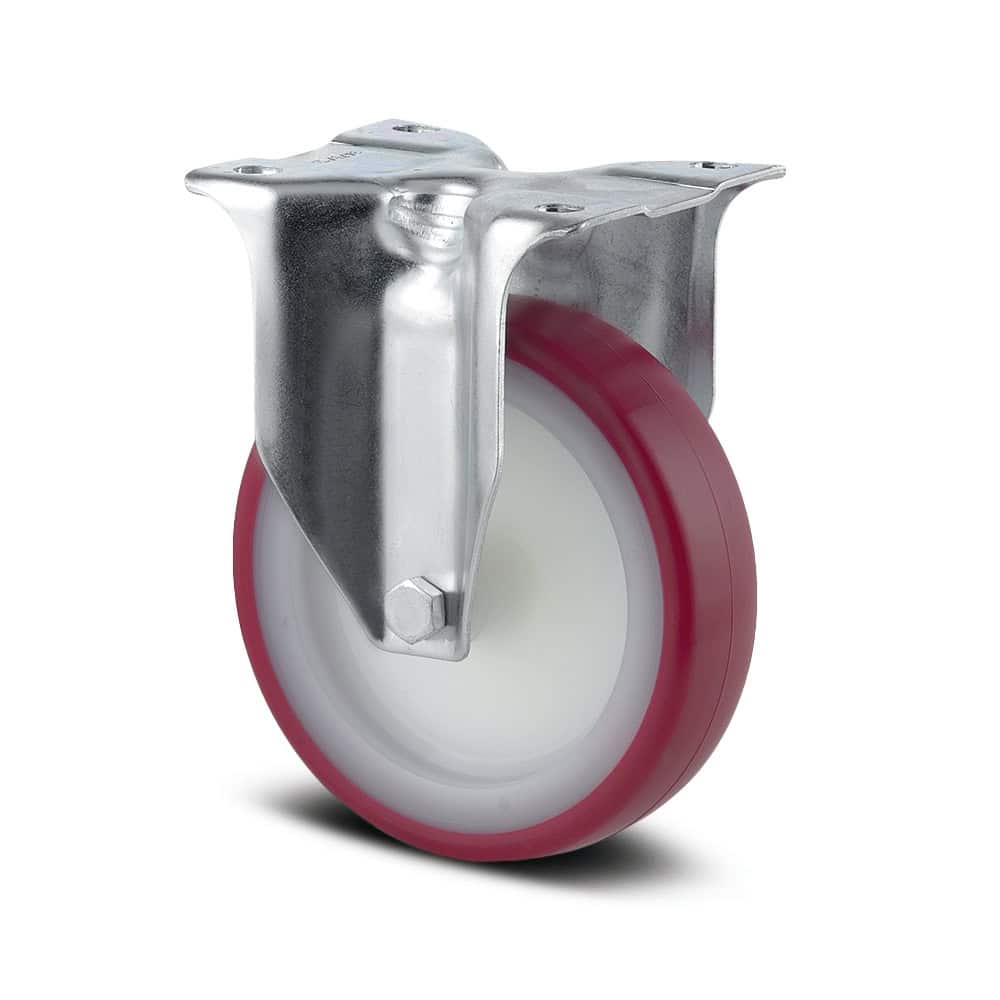Serie ALPHA Rueda fija, Chapa de acero, con pletina zincada brillante, eje de rueda atornillado, pletina de fijación. Núcleo de rueda de poliamida, bandaje de poliuretano inyectado, cojinete de rodillos.