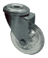 Serie COMPACTA Rueda giratoria, soporte de chapa de acero zincado, rodamiento giratorio de una hilera de bolas, agujero pasante. Núcleo de la rueda de polipropileno, bandaje de poliuretano.