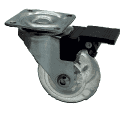 Serie COMPACTA Rueda giratoria, soporte de chapa de acero zincado, rodamiento giratorio de una hilera de bolas, agujero pasante. Núcleo de la rueda de polipropileno, bandaje de poliuretano.