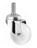 Serie COMPACTA Soporte de chapa de acero zincado cromado, rodamiento giratorio de una hilera de bolas, eje remachado, pletina de fijación. Rueda de polipropileno, buje liso.