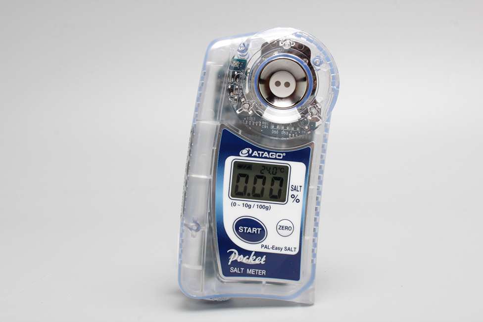 Medidor de concentración de sales en productos en salmueras, productos alimenticios (salsas, sopas, etc.) Mide el contenido de sal de manera directa entre 0 y 10% de salinidad. Mide de 0 a 100% de salinidad diluyendo la muestra en agua des ionizada en proporción 10:1 solo hay que multiplicar el resultado en pantalla por el factor de corrección "10" como se muestra en la siguiente formula: Diluir 1 gm de muestra en 10 gramos de Agua destilada y mezclar. suponiendo que el resultado en la pantalla del equipo sea de 2.2% sal se aplica la siguiente fórmula Salinidad (para muestras >10%) = (Resultado en pantalla) x (10) = (2.2% ) x (10) = 22% de salinidad en la mezcla